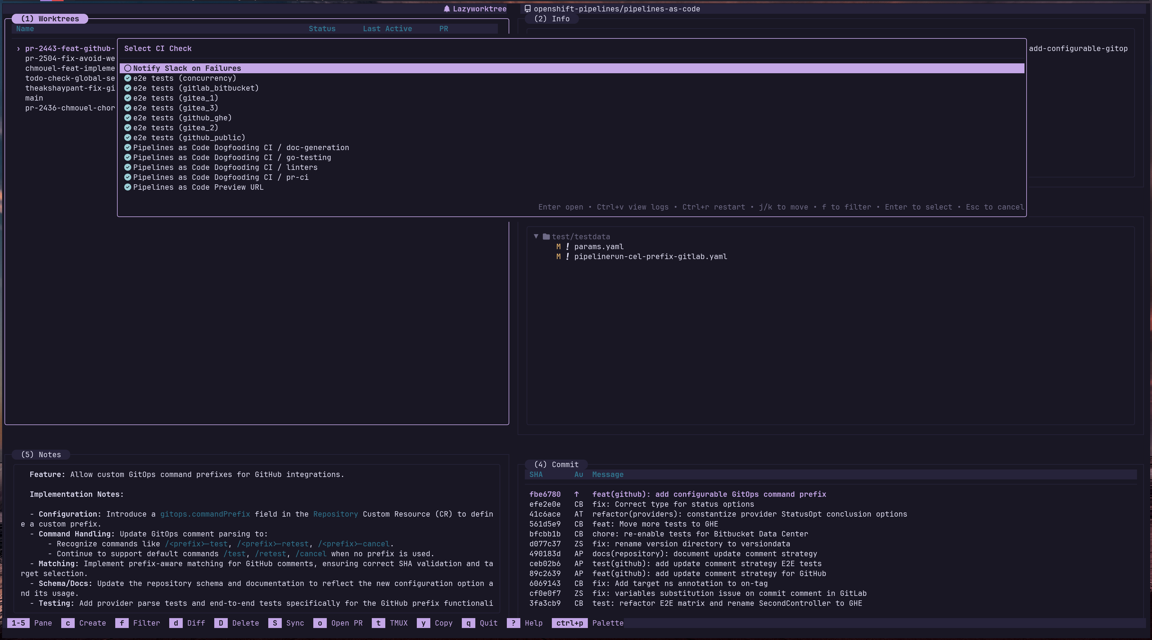 LazyWorktree surfaces pull/merge request information and CI state directly in the status pane.