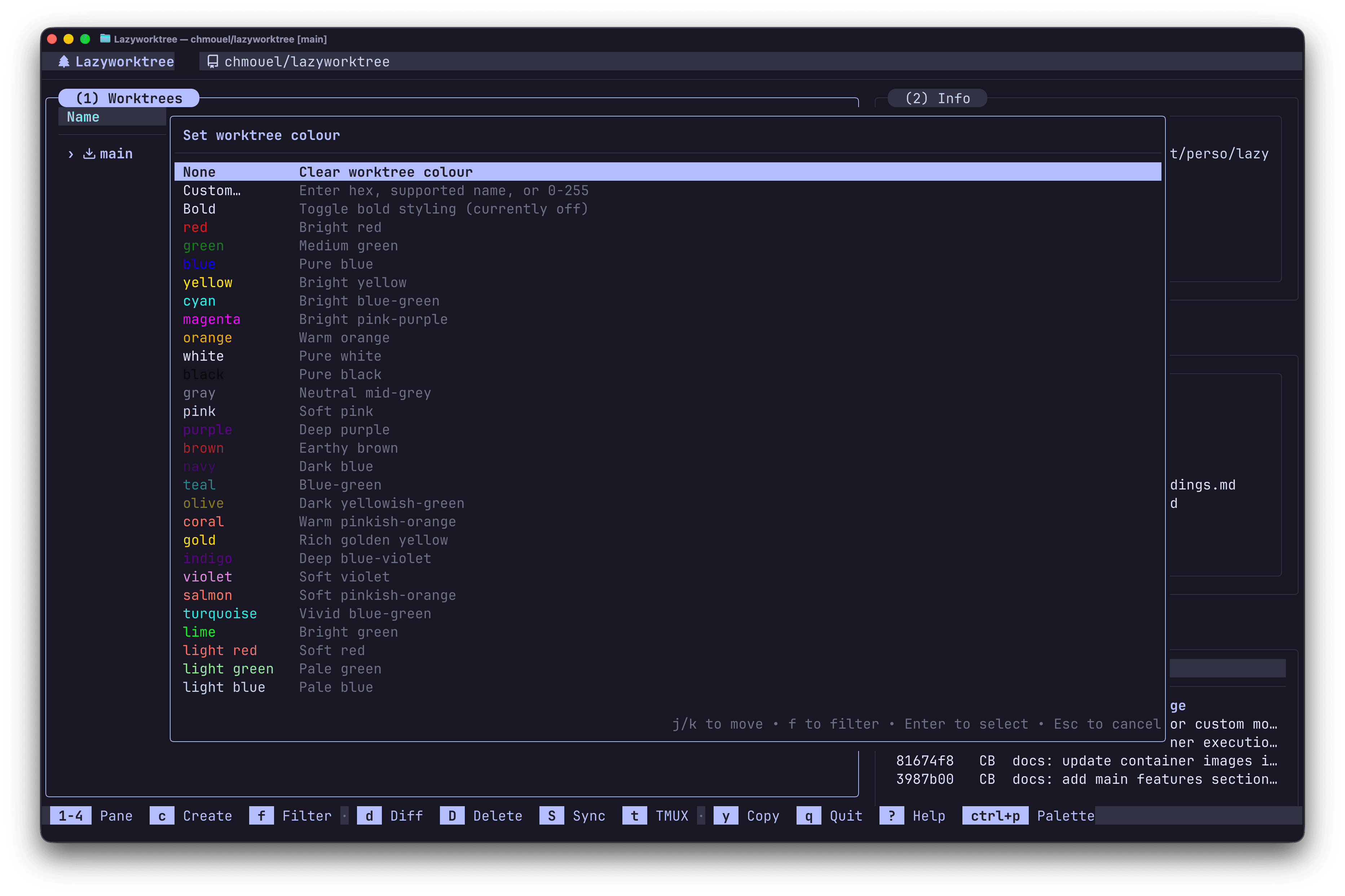 Ctrl+por:) and search for Set worktree colour. - Pick a named colour, a 256-palette index (0–255), choose Custom… to enter a value, or choose None to clear.